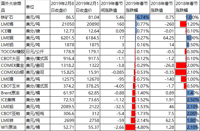 During the Spring Festival of 2019, commodity prices were largely dominated by small declines, particularly in crude oil, amid concerns about a slowdown in world economic growth.